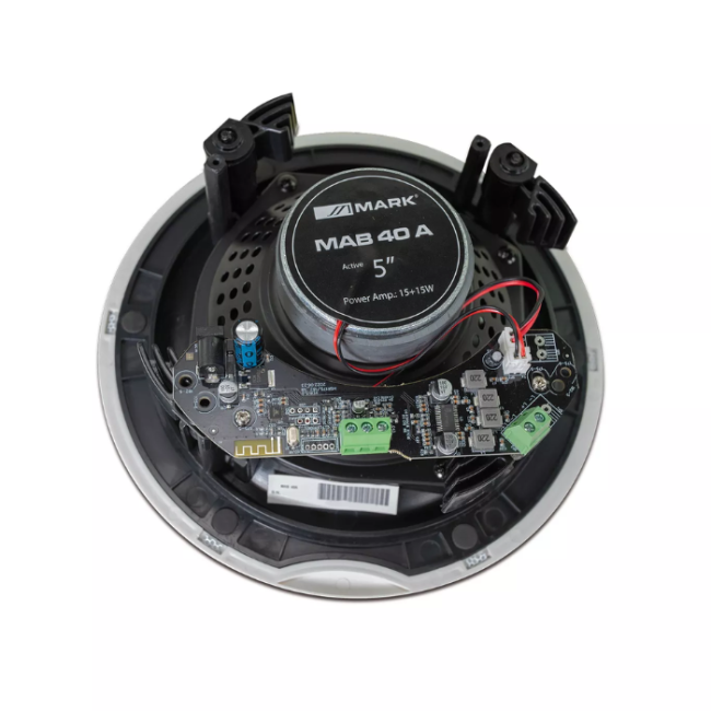 MARK MAB 40A White Pair: Easy-install ceiling speaker system with wireless Bluetooth streaming from the active unit, magnetic metal grille, dual power options, and flush-mount design for discreet audio.
