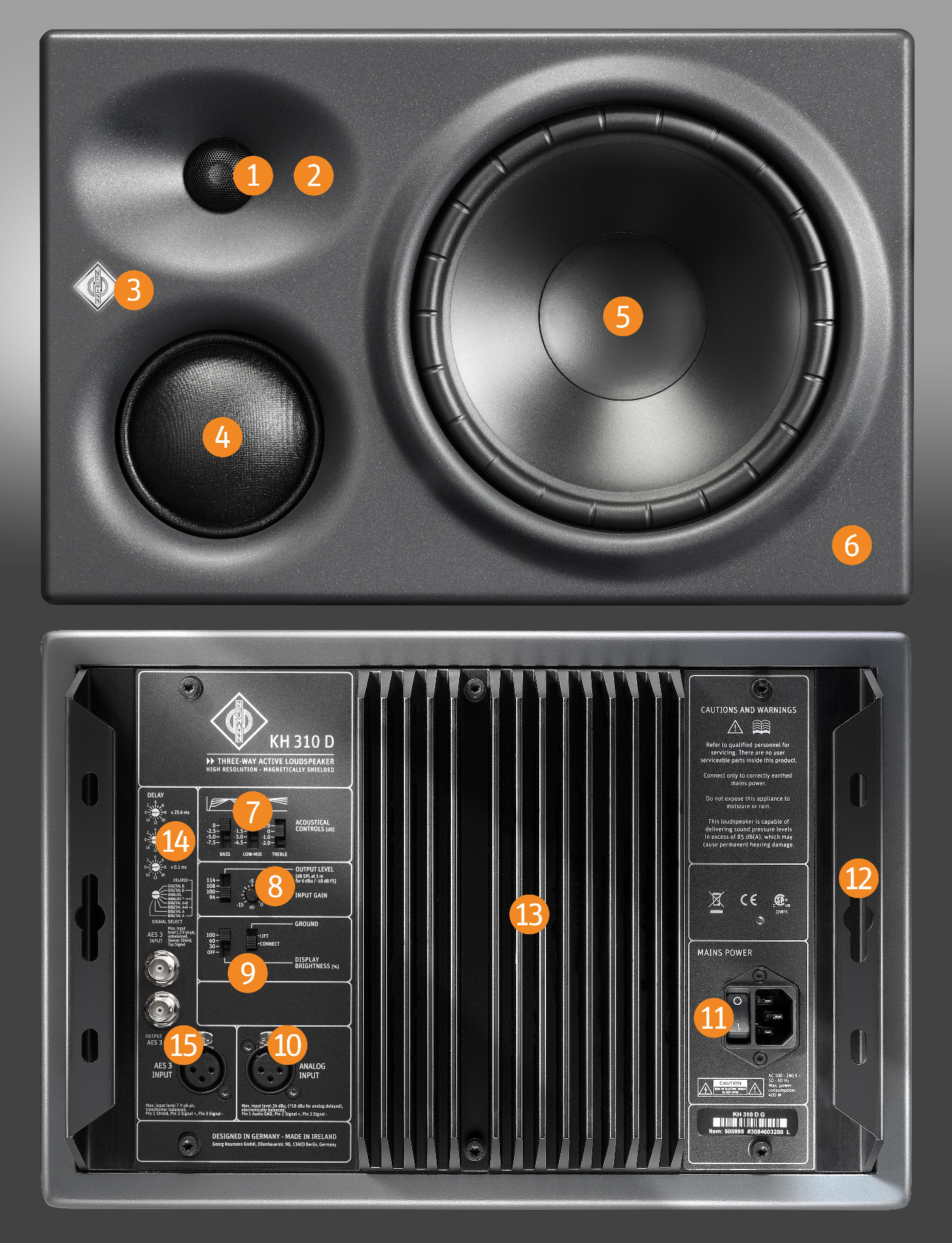 The KH 310 is a three-way tri-amplified monitor with thermally protected Class AB amplifiers (210 W and two times 90 W). Its Mathematically Modeled Dispersion™ (MMD™) waveguide delivers sound waves into the room with superior accuracy. The drivers are modeled using Neumann’s in-house developed software, which reduces non-linear distortion in every situation. Sound distributed in a horizontally precise manner ensures flexibility in the listening position; the narrower vertical dispersion reduces the negative effects of nearby reflections – for example from a desk or mixing console. The precisely controlled dispersion characteristics optimize reproduction in different room configurations and the response is extremely adaptable through various acoustical control settings.