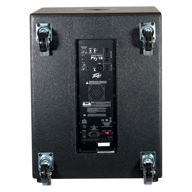The Peavey PVs 18 Sub is a compact vented powered subwoofer system utilizing a 18" heavy-duty woofer, coupled to a DSP controlled power amplifier with 1,000 watts peak available power. The full-length black perforated steel grille provides protection and a professional appearance, along with the sturdy steel handles for moving the Sub. Large heavy-duty locking casters on the rear provide for easy transport on suitable surfaces.