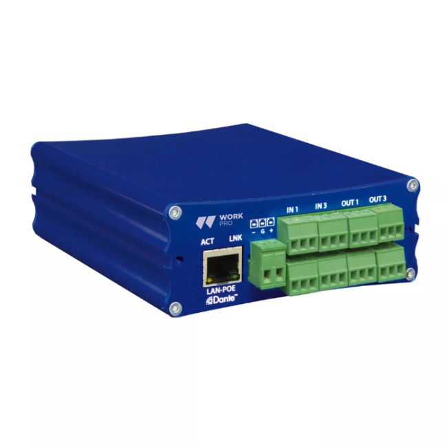 WorkPro DD4 Dante audio converter for BlueLine AoIP systems: bidirectional 4-in/4-out analog-Dante interface with balanced Euroblock connectors, supports up to 96kHz sampling (2x2 mode), ultra-low latency (1ms), PoE or external 24Vdc power, rugged aluminu