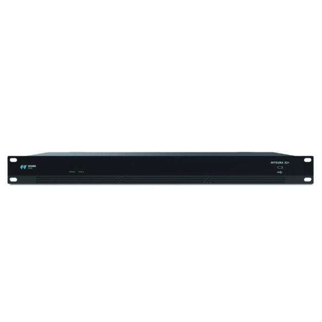WorkPro Integra 32+ (58WIN018): 32x32 DSP matrix with 16 analog/Euroblock + 16 Dante I/O, 31-band EQ, AEC/feedback suppression, automix, 1U rackmount.